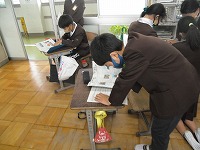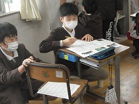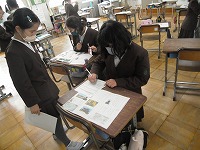 、修学旅行のパンフレットをお互いに鑑賞しあって、気づいたことをメモしあっていました。