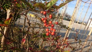 赤い木の実の中には、有名なナンテン(南天)や、センリョウ(千両)、マンリョウ(万両)がありますが、この写真の木の実はたぶんそのどれでもなくて「カラタチバナ」であろうと思います。ただ、はっきり分かりませんので、もし、ご存じの方がいらっしゃいましたらお知らせください。