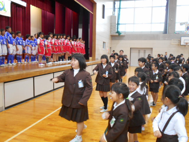サッカー・バスケット競技会壮行会がありました。選手紹介から始まり、選手の模範演技、応援団による「フレフレコール」がありました。選手代表は、「最後まで、全力でがんばります」とあいさつしました。