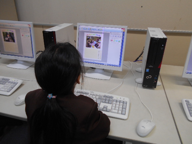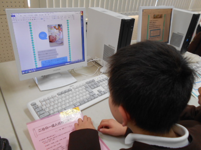 今日は多くの学年がコンピュータを使っての学習をしました。1年生は、2学期から始めた「いいこといっぱい1年生」で1年生の思い出をまとめました。4年生は、2分の1成人式の掲示物を自分の小さいときの写真などを貼り付けて作成しました。5年生はプログラミングの学習です。自分で描いた絵を動かして楽しく学習しました。