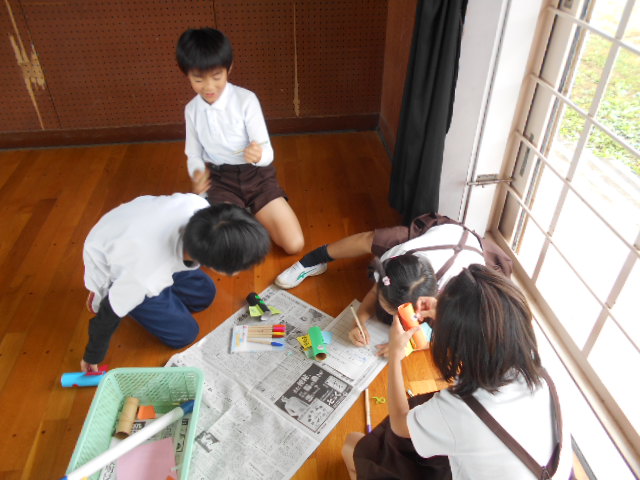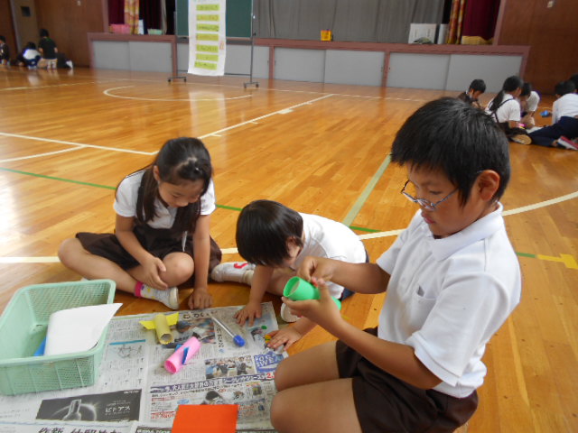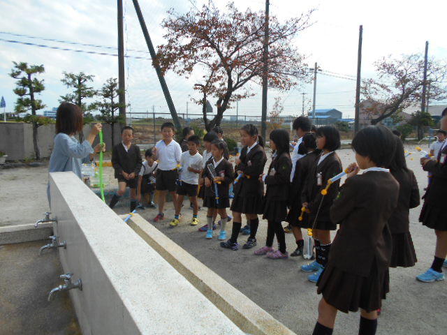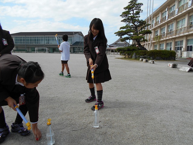 4年生は、「閉じ込めた空気と水」の学習で、水でっぽうや噴水で遊びました。運動場に歓声が響きました。