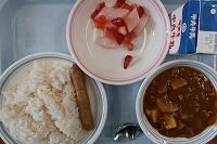 麦ご飯 カレーライス 牛乳 フランクフルト イチゴ入り紅白お祝いゼリー