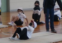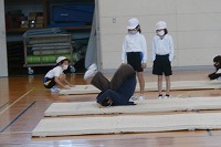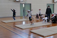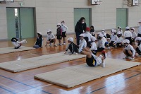 2年生が体育でマット運動を行っていました。子どもたちは、先生の良い見本や悪い見本を見て、どうするとよいのか考えました。