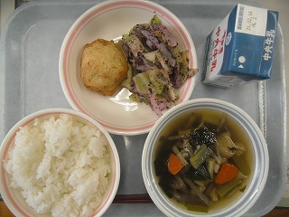ご飯 牛乳 手作りはんぺん ゆかり和え 沢煮椀