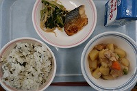わかめご飯 牛乳 鯖(さば)の醤油麹(しょうゆこうじ)焼き 鶏じゃが 小松菜ともやしの和え物