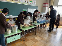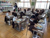 今日は1年生が初めての給食でした。6年生に助けてもらいながら,初めての給食準備を楽しく行うことができました。献立はカレーライス,れんこんチップス,こうはくゼリーポンチ,牛乳でした。