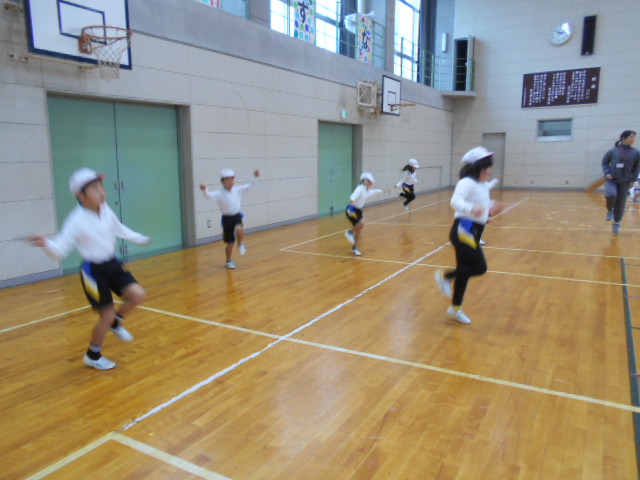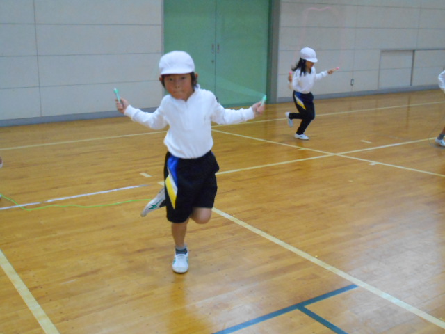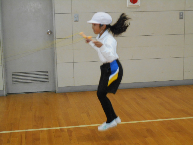 2年生は、いろいろな跳び方で縄跳びの練習をしています。