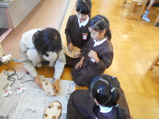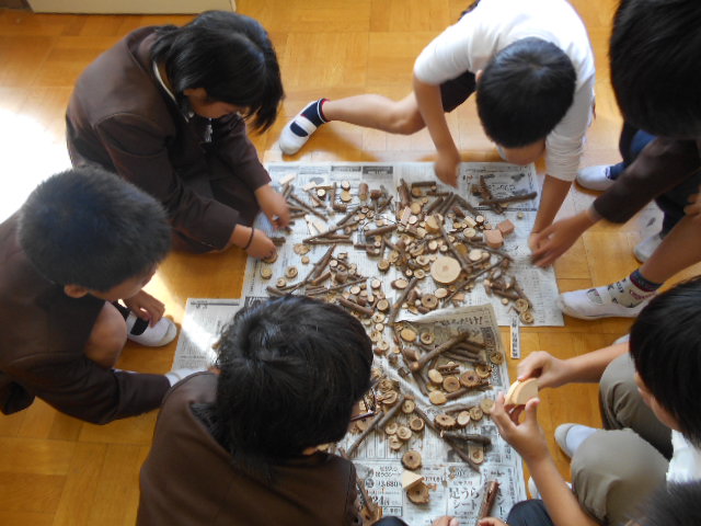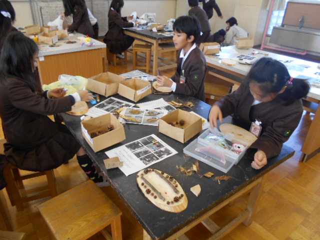 4年生は、「あいち森と緑づくり事業」の取り組みで、森林の学習をしました。いろいろな木の実を使って、写真立てを作りました。