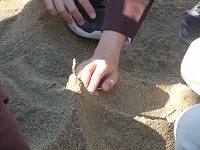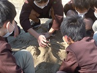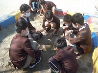 6年生の男子が2限の放課(休み時間)に砂場で集まっていたので見てみると、砂山を作って、真剣に山崩しをしていました。経験した人ならわかると思いますが、砂山のてっぺんに棒を立て、周りから少しずつ砂をとっていき、棒が倒れたら負けというゲームです。
