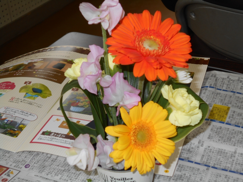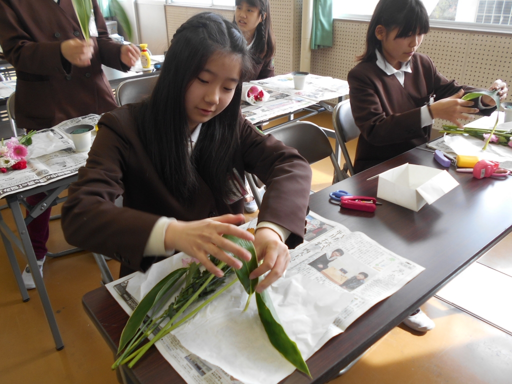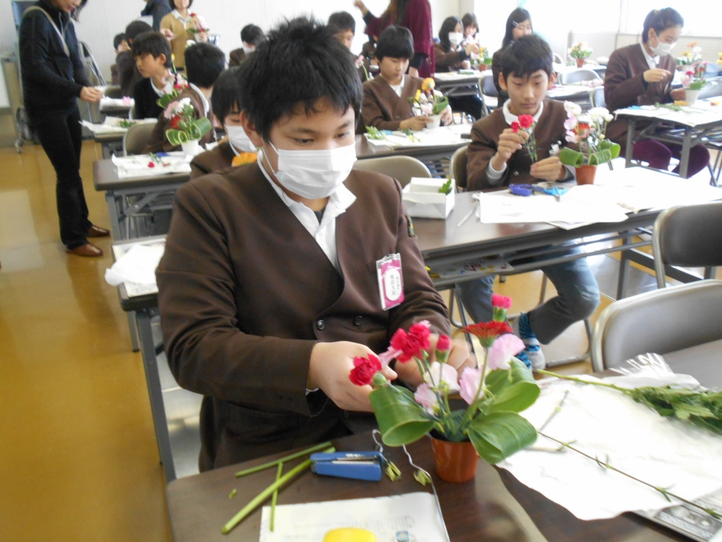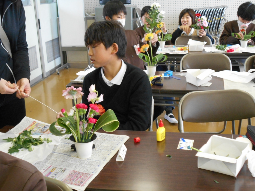 6年生は、花育教室がありました。講師の先生に来ていただき、フラワーアレンジメントの講習を受けました。素敵な作品が出来上がりました。