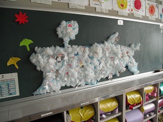 1年生の教室には大きなクジラ雲が貼ってあります。