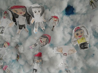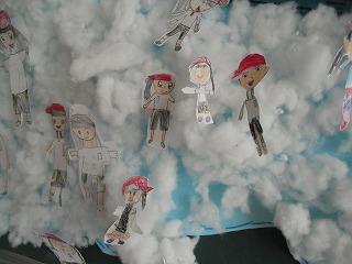 大きな紙の全面に、綿を敷き詰めて貼ってあるだけでなく、近づいてみると、その雲には子どもたちがのって遊んでいます。