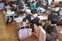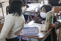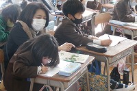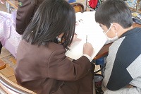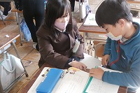 1年生が国語で、学校にあるものについてのクイズを作っていました。順番にヒントを出していって、そのヒントが当てはまるものを答えるものです。どんなヒントをどんな順番で言うかによって難しさが変わります。隣同士で話し合いながら、ヒントを考えていました。