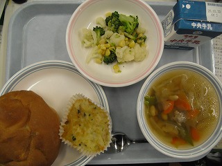 リンゴパン 牛乳 ジャガイモチーズ焼き、花野菜サラダ コンソメスープ