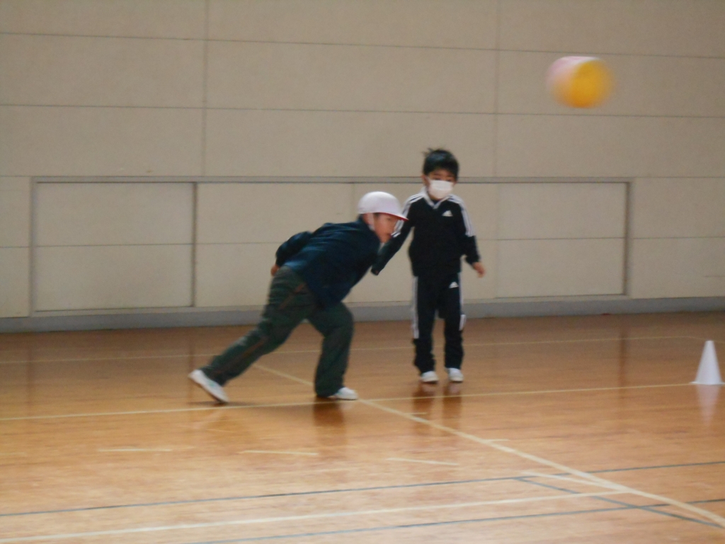 1年生は、体育の時間にドッジボールをしました。1年間で、ずいぶん強いボールが投げられるようになりました。