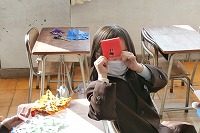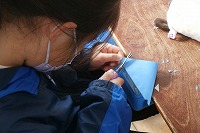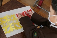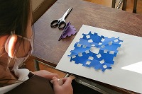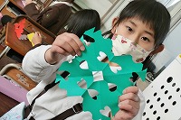 2年生が折り紙を折って、切って、開いて飾りを作っていました。折り方や切る形を変えると開けた時の模様が無限に広がります。子どもたちは夢中になって作品を作っていました。