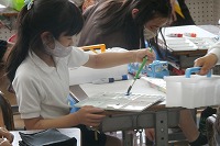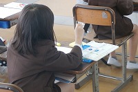 3年生が図工で絵の具を使う練習をしていました。パレットに少し絵の具をのせ、筆に水をつけて薄めていきます。いろいろな色を少しずつ混ぜて、好きな色を作ってみます。
