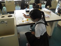 4年生が、注射器で空気を押しつぶす実験をしていました。針のない注射器にふたをして、ピストンを差し込んで押さえると、途中まではピストンが入りますが、あるところ以上には押さえられなくなります。空気にどんな性質があるのか、その一つがわかってきます。