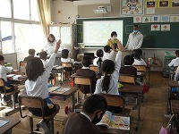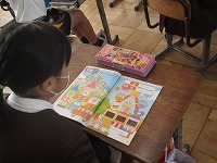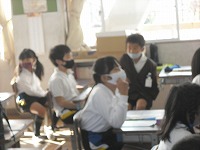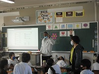 3年生が英語でいろいろな形の学習をしていました。先生が用意したいろいろな形のカードで言い方を学習した後、教室内にあるものの中から形を探しました。また、教科書の絵の中から知っているものや形を見つけたり、Nick先生の声を聴いて指さしたりするゲームをしていました。