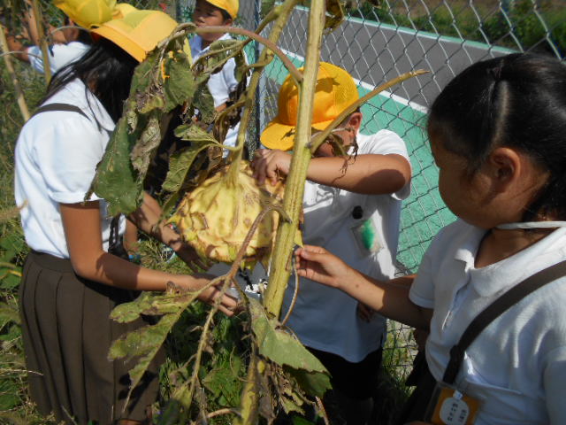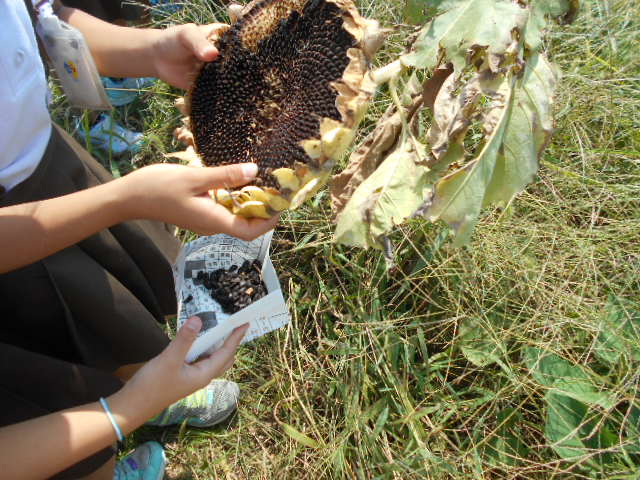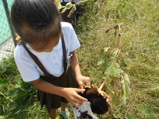 3年生は、ひまわりの種をとりました。たくさんの種がとれました。