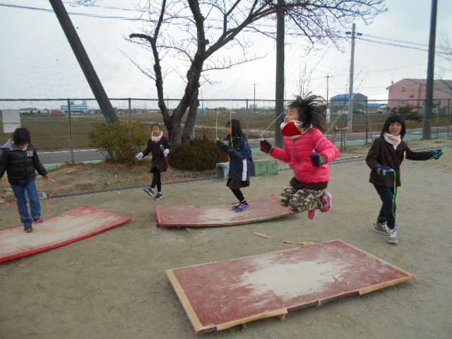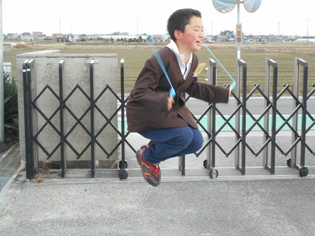 昼の休み時間には、多くの子が、なわとびをしていました。先生手作りの二重跳び練習板を使っている子もいます。卒業までに全員二重跳び連続3回を目指します。