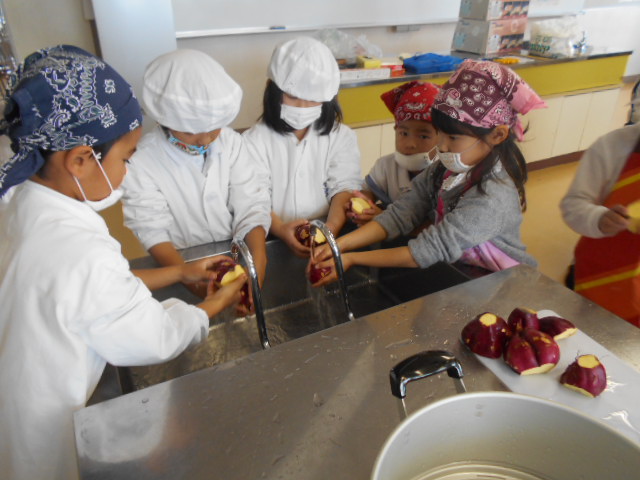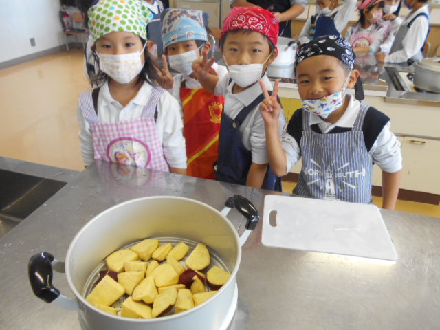1年生は、サツマイモを茹でたり、蒸したりしました。先生に手をとってもらい、包丁でサツマイモを切ったり、丁寧に洗ったりして準備しました。
