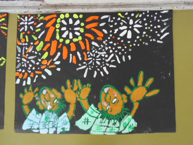 3年生は、図工の時間に花火の絵を描きました。パパーンと音を立て、夜空に美しく映える花火を表現できています。