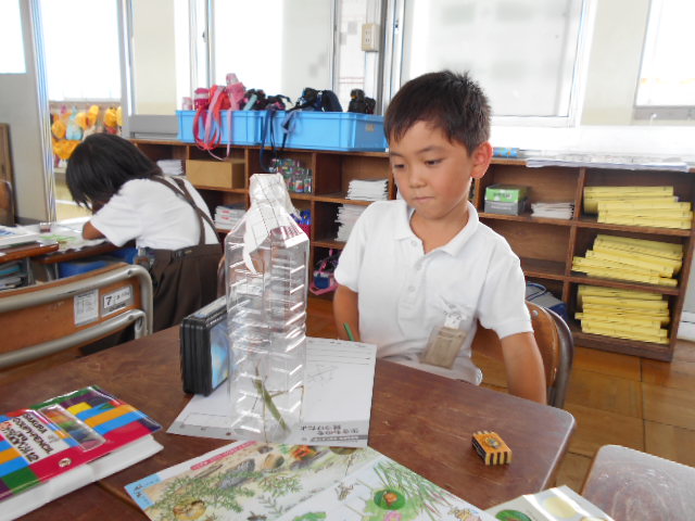 2年生は、生活科の勉強で、生き物の観察をしています。よーく見てワークシートに気がついたことを記入しました。