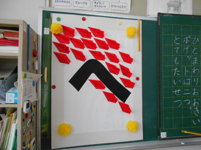 運動会のテーマの看板づくりも進んでいます。1年1組は、紙飛行機に、目標を書き、文字の周りを飾りました。2年2組は、手形に目標を書きました。