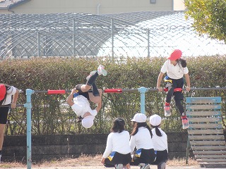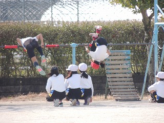 秋晴れの下、3年生が鉄棒に取り組んでいました。