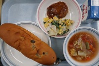 レーズンロールパン 牛乳 デミグラスハンバーグ 春菊とツナのサラダ コンソメスープ