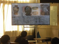 、愛知県の伝統工芸のリーフレットについて発表していました。リーフレットをタブレットで撮影して、テレビ画面に拡大し、話している内容についてわかりやすく説明していました。