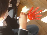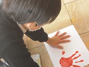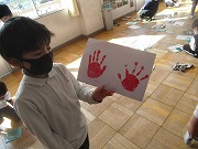 2年生は生活科で成長の記録として自分の手形をとっていました。水彩絵の具で自分の手に絵の具を塗り、画用紙に手形を押します。手に感じる絵の具の感覚が面白いのか、みんな楽しそうです。