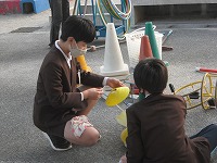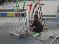 先日の委員会で、体育委員会は体育倉庫を大掃除していました。動かせるものを外に出して中の掃除をしながら、ボールの空気を入れたり竹馬の高さをそろえたりと、様々な用具の点検整備をしていました。