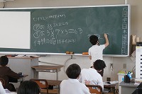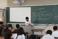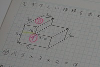 5年生が算数で立体の体積の学習をしていました。児童自身が難しい問題を作ってクラスに問い、みんなでその問題に挑戦しました。ただの立方体や直方体ではなく、一部が欠けた立体なので、簡単ではありません。