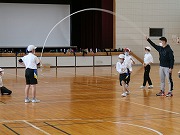 4年生が体育で連続縄跳びに挑戦していました。多人数の児童が交代で一人ずつ連続して跳んでいき、30秒や1分という、一定時間に延べ何人が跳べるかという競技です。