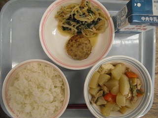 ご飯 牛乳 大根のうま煮 米麹ハンバーグ もやしのツナ和え