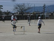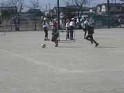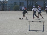 4年生が体育でサッカーをしていました。良い天気で過ごしやすい気候の中、楽しそうにボールを競り合っていました。コートを小さめにして、ゴールをハードルにしてあるので、力任せにけっては入りません。力は弱くても、素早くコントロールすることが大切です。