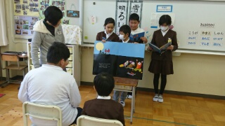図書委員会では、明日、保育園に行って園児に読み聞かせをする予定です。その練習もかねて、朝の読書の時間に教室で、自分達の担当する大きな絵本を見せながら読み聞かせを行っています。