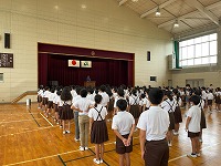 本日はⅠ期の最終日です。児童の皆さんが楽しみにしている夏休みが明日から始まります。児童の皆さんには有意義な夏休みにしてほしい、安心安全に夏休みを過ごしてほしいと願っています。朝礼では、先生たちから全校児童に夏休みに向けたお話をしました。くれぐれも体調管理には十分気を付け、楽しい夏休みを過ごしてください。
