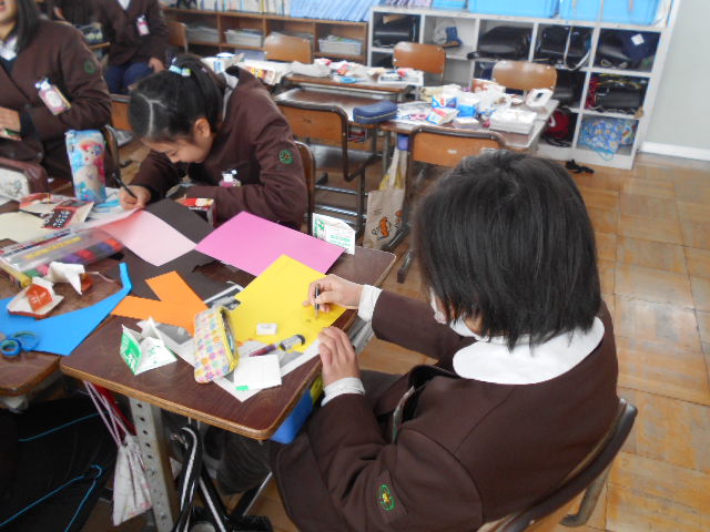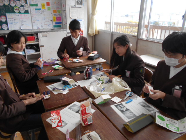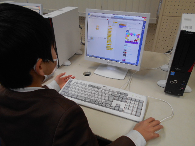 6年生は、総合の時間に、佐織特別支援学校との交流会でプレゼントする牛乳パックで作る跳ねるおもちゃを作りました。プログラミングの勉強では、ねこの動きを決めて、いろいろ動かしました。