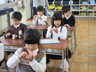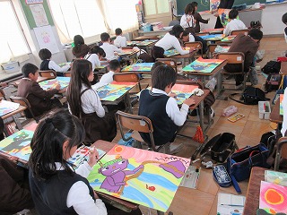1年生はカードを使っての計算練習。繰り上がりや繰り下がりのある計算もできるようになってきました。3年生は、民話「島ひき鬼」を描いていました。構図や場面・色彩はほぼ同じですが、よく見ると少しずつ個性が出ていて楽しいです。