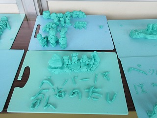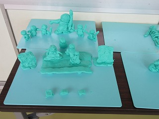 2年生が、先週作った粘土の「ペッパー博士・・・」。作り足しているのか、毎日、板の上の様子が違っているようです。今日は、ずらりと並んで発表する様子がさらに表れていました。