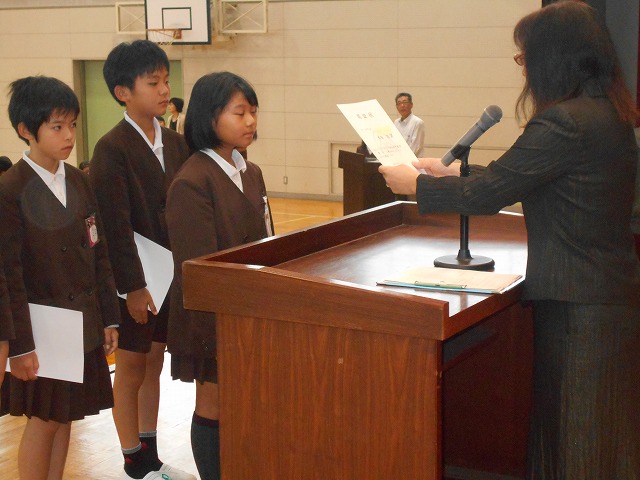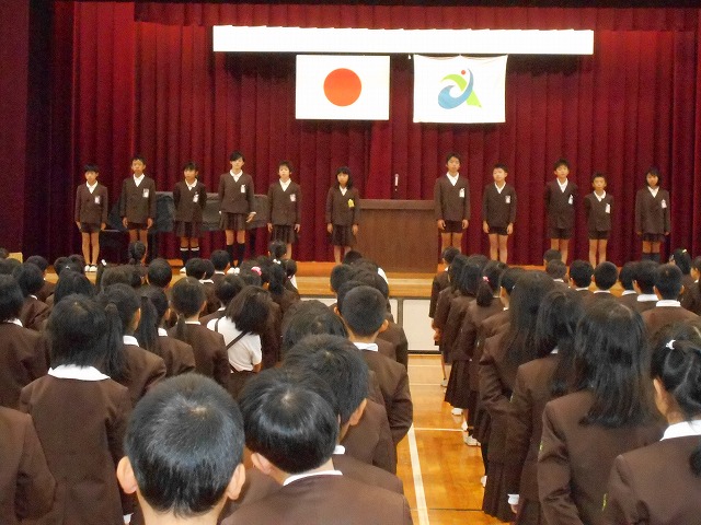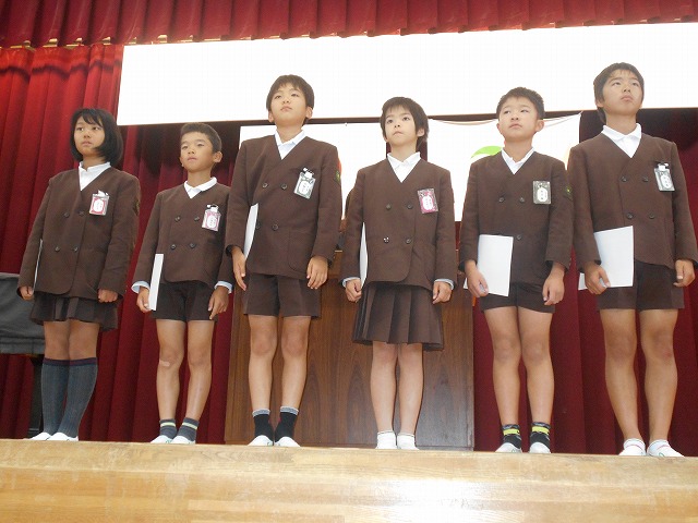 後期児童会役員の認証式と引き継ぎ式が行われました。前期役員は、半年間のお礼を、後期役員は、これからの意気込みを力強く述べました。