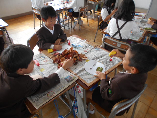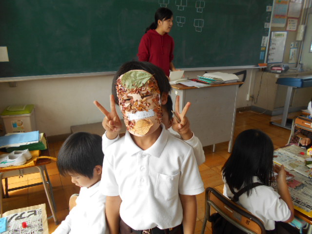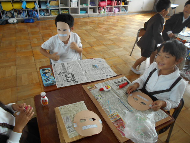 1年生は、紙に落ち葉を貼ってお面を作りました。思い思いの葉っぱを使い、秋を楽しみました。