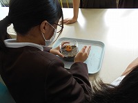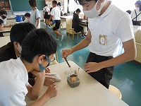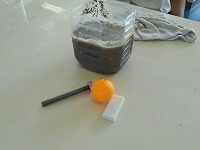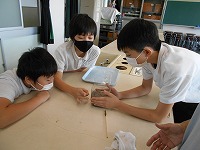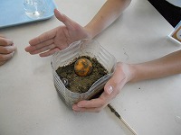 6年生が理科で地面の液状化について実験していました。ペットボトルの中に消しゴムやピンポン玉を埋め、金属のボルトを半分埋めた状態で刺します。土の中には少し水が入っています。