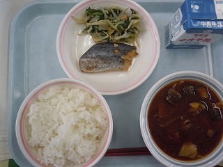 ご飯 牛乳 鰆の醤油麹焼き ほうれん草のなめたけ和え 秋野菜の味噌汁