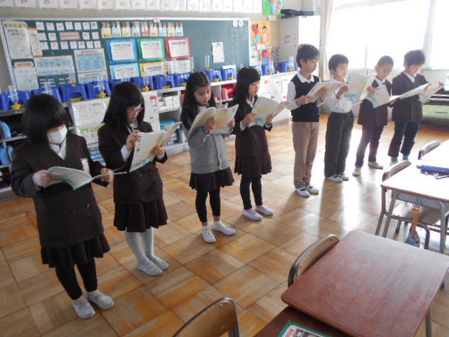 2年生は、国語で話し合いの仕方の勉強をしています。まず、教科書の例を音読して話し合いの仕方を練習しました。