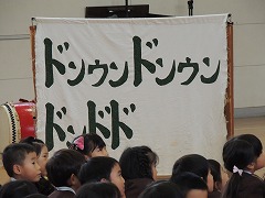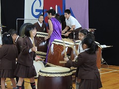 子どもたちが前に呼ばれ、実際に太鼓をたたく体験をさせてもらったりもしました。