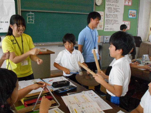 6年生は、算数で、拡大図をかく勉強、5年生は、音楽で、いろいろな楽器を使って、リズムを選んでアンサンブルをつくる勉強をしています。